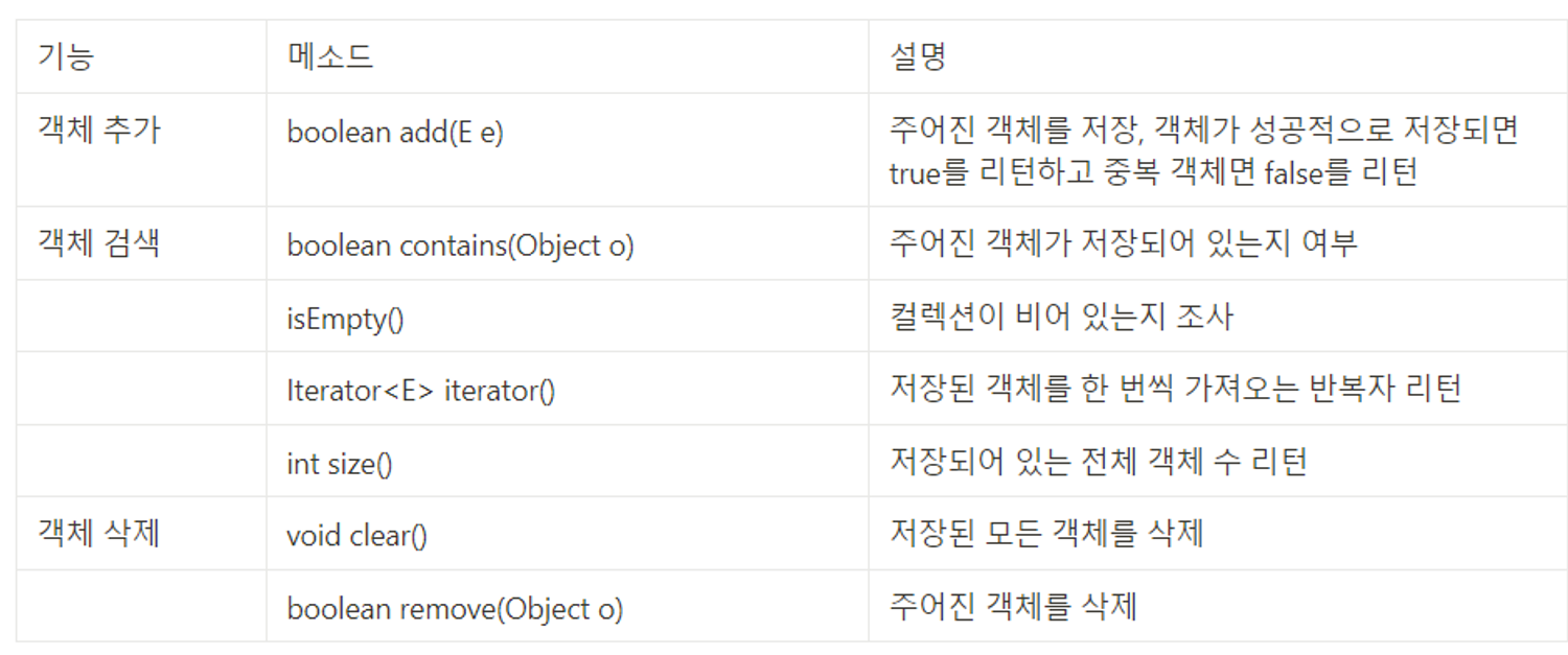 set 컬렉션은 저장 순서가 유지되지 않음. 또한 객체를 중복해서 저장할 수 없음.
