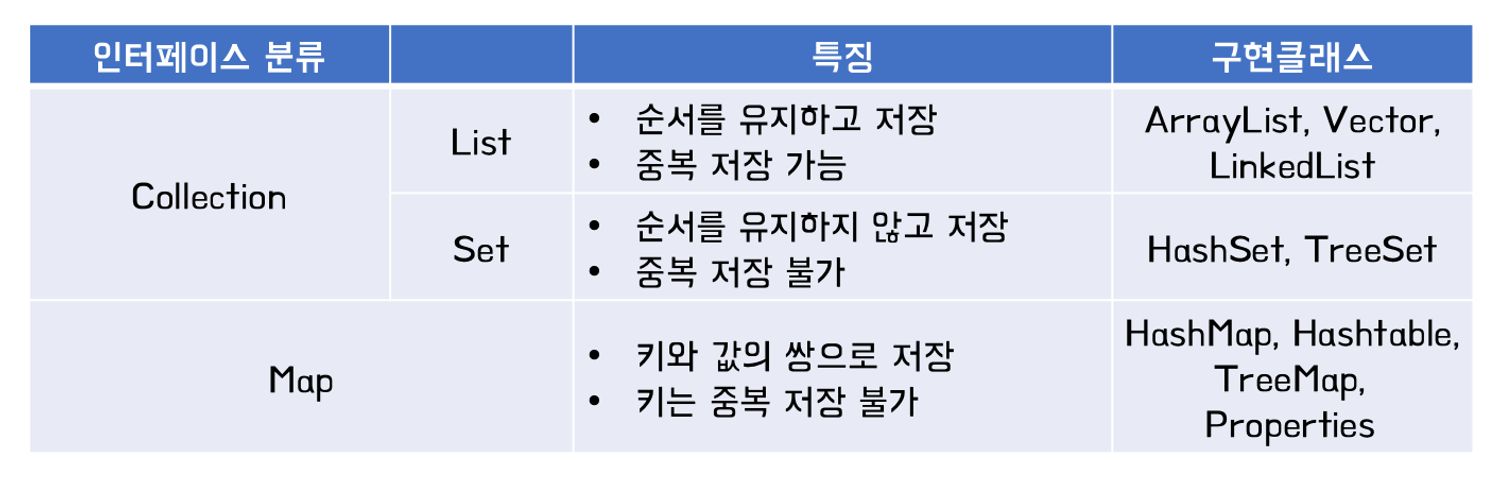배열의 문제점을 해결하기 위해 java.util 패키지에 컬렉션과 관련된 인터페이스와 클래스들이 존재함. 이들을 총칭해서 컬렉션이라고 함. ex) List, Set, Map